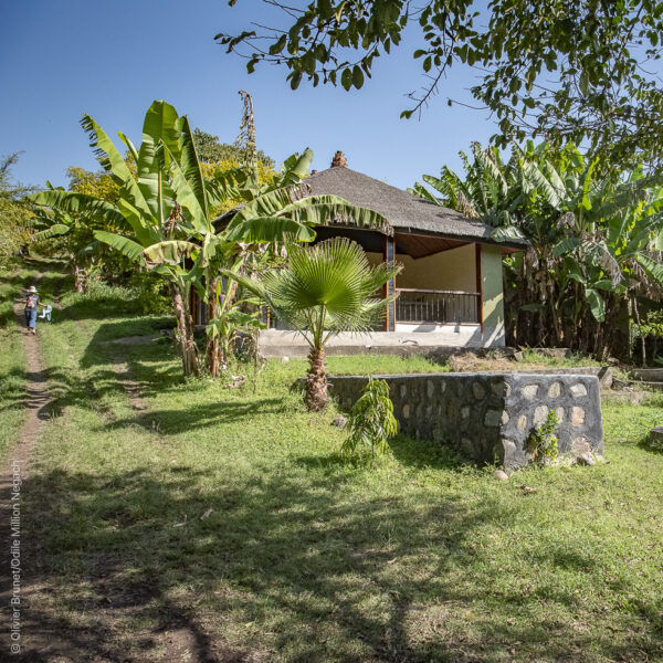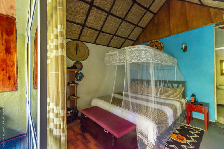 The woodwork and dark wood furniture, the white draped four-poster bed and the bathroom evoke the typical charm of Ethiopia.